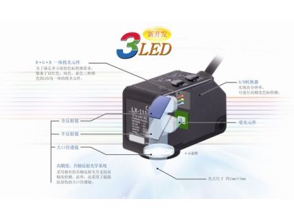 同時使用三種顏色(R·G·B)的LED,通過反射光的R·G·B比率高精度判別色標顏色。也可有效檢測色標周圍那些帶花紋及圖案的薄膜等