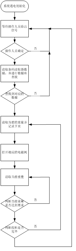 操作人員在指定位置放好收料罐后(收料罐上的條碼對準(zhǔn)條碼讀取器),按下啟動按鈕開始進入工作程序。首先,主控制器會讀取條碼讀取器的數(shù)據(jù)(條碼編號);然后,主控制器會在數(shù)據(jù)庫中尋找是否有符合當(dāng)前要求的條碼編號。如果查找成功就按照對應(yīng)的工藝要求進行操作(進入投料狀態(tài)),如果查找失敗就會發(fā)出報警提示,提醒工作人員進行檢查。