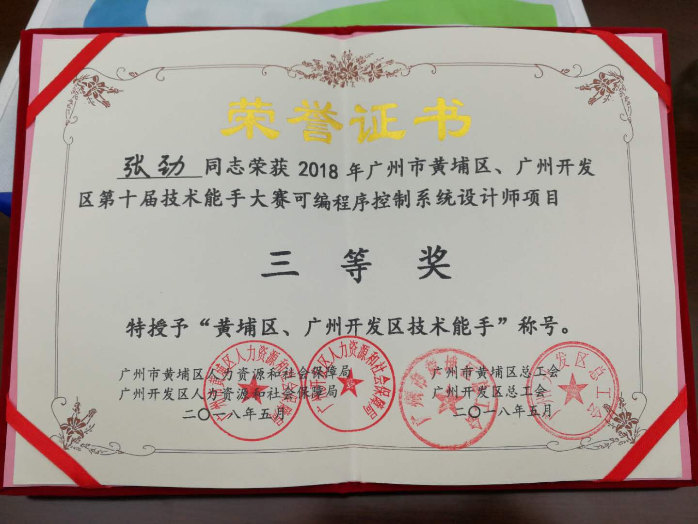 貫徹中共中央、國務(wù)院《關(guān)于進(jìn)一步加強(qiáng)高技能人才工作的意見》精神,積極參與廣州市黃浦區(qū)技能人才隊(duì)伍建設(shè)。2018年5月9日,廣州奇峰機(jī)電設(shè)備有限公司員工參加了廣州市黃浦區(qū)第十屆“技術(shù)能手大賽”可編程序控制設(shè)計(jì)師項(xiàng)目。我司張勁同志榮獲三等獎(jiǎng)。